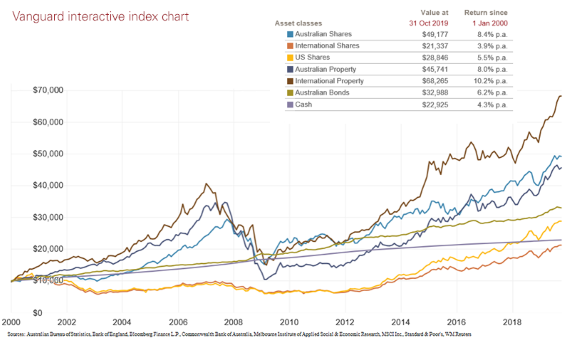 A $10,000 investment into international listed property over the same time frame would have returned 10.2 per cent per annum and be worth more than $68,000, using the same assumptions as above. That equates to a 580 per cent total return. Investors in any of the major asset classes would have done well over the past 20 years, and obviously those with investments across multiple asset classes would have achieved the smoothest returns.