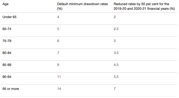 The Government is temporarily reducing minimum drawdown requirements for account-based pensions and similar products by 50% for the 2019/20 and 2020/21 financial years.