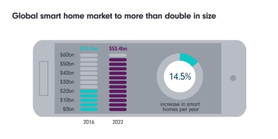 Examples of these smart technologies include activity sensor systems that detect abnormalities in seniors’ routines and alerts caregivers if help is needed. The global smart home market was valued at around $24.1 billion in 2016 and is expected to grow to $53.45 billion by 2022, an increase of over 14.5 per cent each year.15
