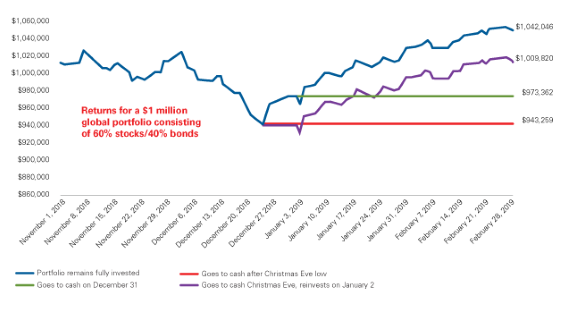 If the investor cashed out in December and then reinvests just a few days later, the value of their portfolio is still not as high as if they had remained.