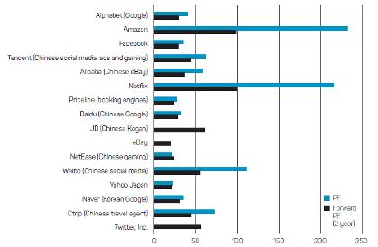 Chart 2 shows the PE and forward PE ratios of the largest constituents of the Internet Software & Services and Internet and Direct Marketing Retail industries, which includes the ‘FANGs’. The forward PE ratio is measured as current price relative to the consensus earnings forecast for 2019. The chart is sorted from largest company to smallest company by market capitalisation.