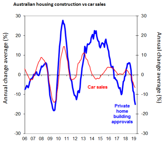 However the key concern for Australia is the consumer’s resilience to a trifecta of troubles. Falling house prices, high household debt and slow income growth have proven to be a troubling trio for the Australian consumer. This trifecta of troubles has seen the consumer struggle to maintain their spending appetite. Notably the very sharp falls in both new housing construction approvals (blue line) and car sales (red line) over the past year shows that Australian consumers have become very cautious.