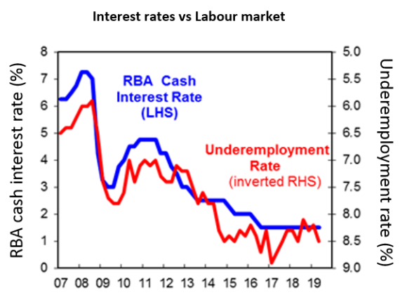 Yet this puzzle seems set to be solved. Australia’s underemployment rate has remained stubbornly high and above 8% for the past four years, indicating that part-time workers are struggling to obtain sufficient hours (inverted red line). The underemployment rate now stands at 8.5%, suggesting that the labour market is actually soft rather than strong. So for the RBA, this disappointing underemployment performance could prove to be the catalyst for interest rate cuts in the coming months.
