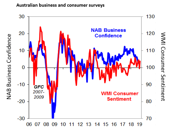 Source: NAB Business Survey and Westpac Melbourne Institute (WMI) Consumer Sentiment survey.