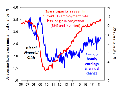 However the most surprising aspect of the current environment is that US wage increases have been reasonably modest at only 2.7%. In 2007 when the labour market was similarly stretched with limited spare capacity, US wages growth was running at 3.5% annual pace. So why are US workers so cautious in exercising their increased bargaining power to push for higher wages? Essentially we do not know. Perhaps there are many discouraged workers who are sitting on the sidelines, so there is more space capacity than the unemployment rate indicates. Perhaps the painful memory of the GFC is still constraining workers from pushing for higher wages. So the US labour market is a puzzle presently and only time will resolve this conundrum.