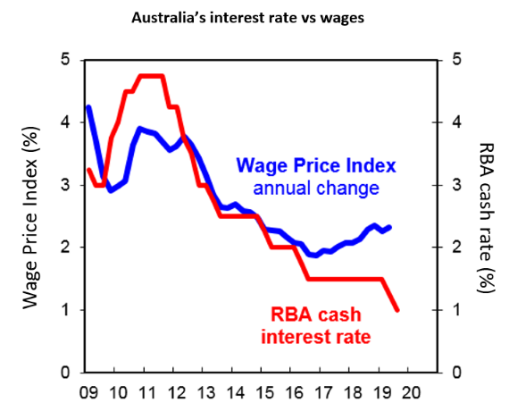 For the RBA, this slow wage growth suggests the task of generating higher inflation is much harder. Hence the RBA has pushed the envelope already by cutting the cash interest rate to only 1% (red line). The RBA Governor is optimistic that the Australian economy “may have reached a gentle turning point”. For workers, let’s all hope that the turning point is now.
