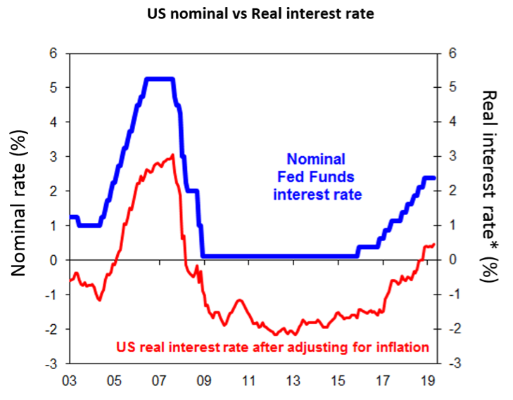 Where President Trump may have cause for being ‘fed up’ is whether US interest rates are too high now. Current US inflation pressures are modest with the annual core CPI inflation rate running at only 2% and inflation expectations around 1.7%. Taking the nominal US interest rate and then subtracting these inflation measures shows that the real US interest rate averages only 0.5% (red line*). Essentially current US nominal interest rates barely compensate for inflation. By historic standards the US real interest rate, now at 0.5%, is still low compared to the 3% level reached in 2007.